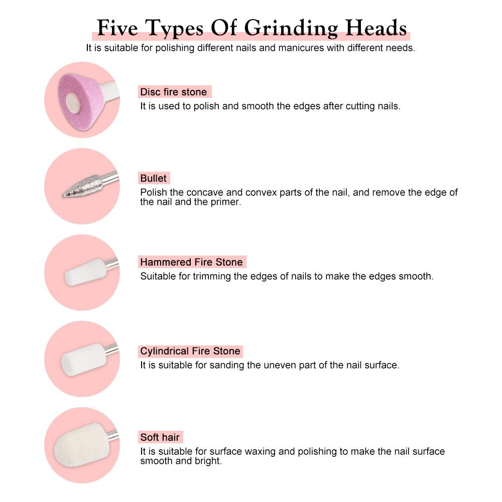• 5 ​​wielorazowych głowic – do piłowania, nadawania kształtu, szlifowania, polerowania i wykańczania, aby uzyskać idealne paznokcie każdego dnia.
