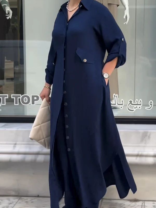 Długa koszula wygląda swobodnie, a jednocześnie elegancko. Możesz ją nosić zapiętą na guziki, aby uzyskać elegancki wygląd, lub rozpiętą na podkoszulku, aby uzyskać bardziej swobodny look. Spodnie z szerokimi nogawkami optycznie wydłużą sylwetkę i zapewnią Ci całodzienny komfort, niezależnie od tego, czy wybierasz się na brunch z przyjaciółmi, do biura, czy na drinka o zachodzie słońca.