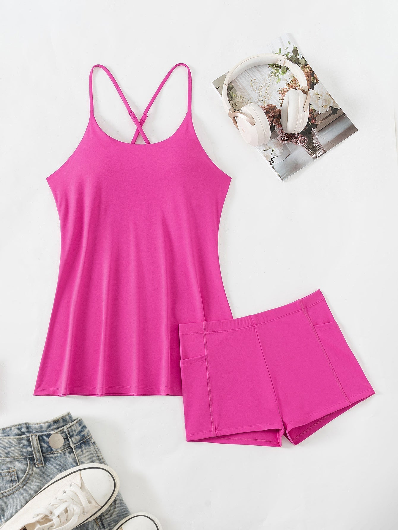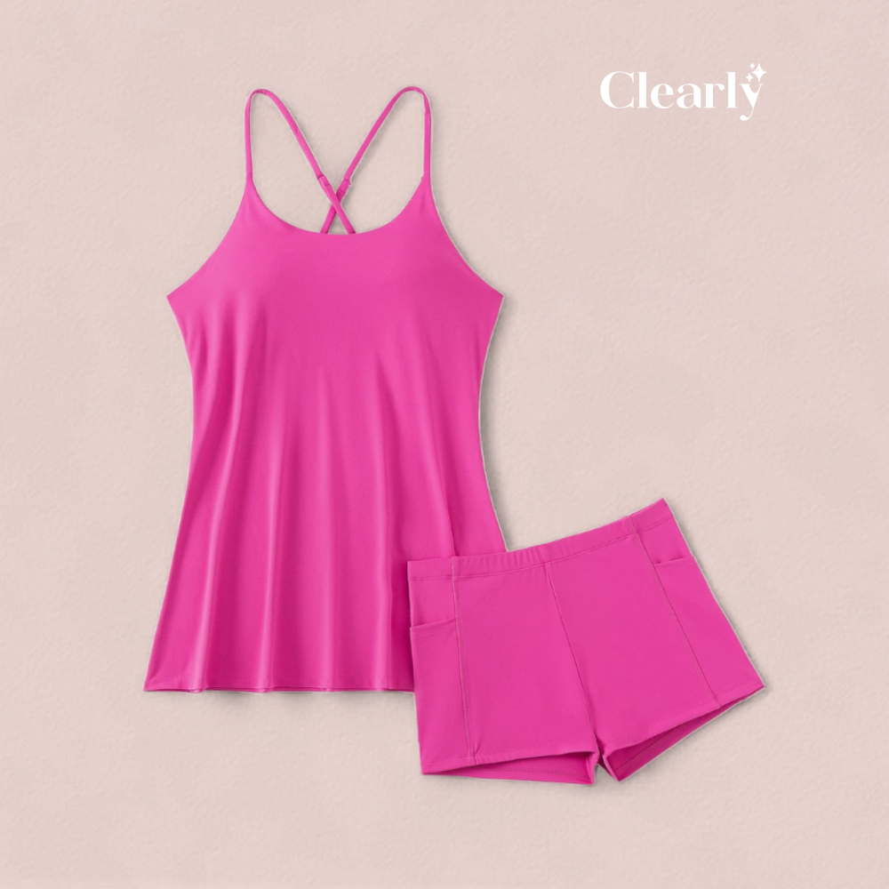 Ciesz się lekkością i zwiewnością sukienki w połączeniu z spokojem szortów z wszytymi wstawkami – a także praktycznymi kieszeniami bocznymi na telefon, klucze lub balsam do ust. Wreszcie strój bez zbędnych poprawek – idealny na spontaniczne spacery, zakupy lub relaksujący weekend w domu.