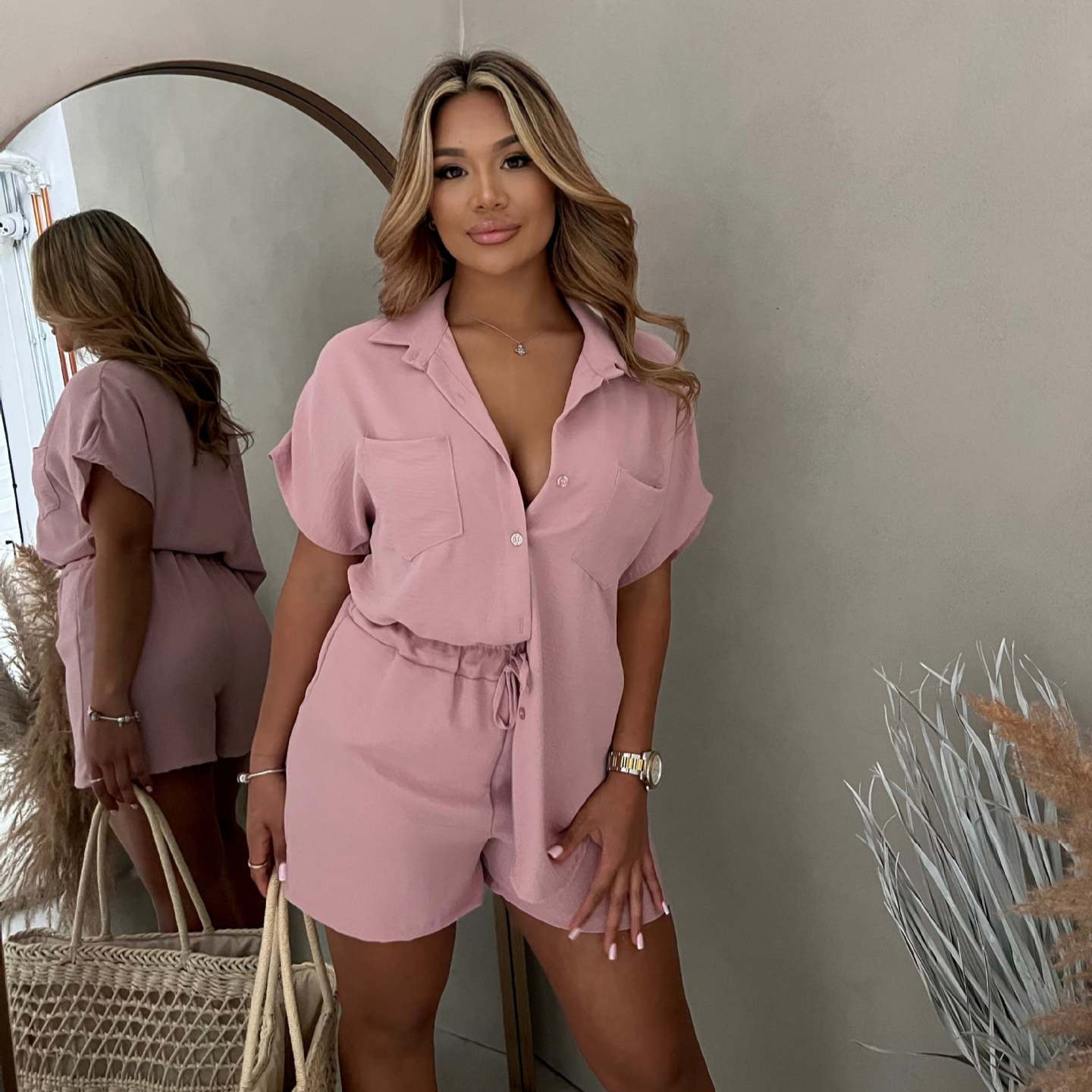 Ten stylowy dwuczęściowy komplet z miękkiego, wygodnego materiału składa się z eleganckiej bluzki z krótkimi rękawami, guzikami i praktycznymi kieszeniami na piersi, a także spodenek ze sznurkiem, elastyczną talią i kieszeniami bocznymi – idealnych na niezbędne rzeczy podczas zabieganych dni pełnych aktywności.