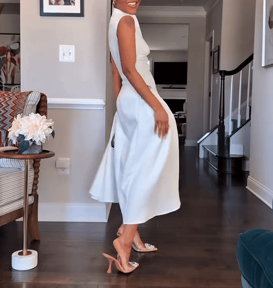 Zdobądź natychmiastową pewność siebie i przyciągaj wzrok od razu po założeniu tej eleganckiej sukienki bez rękawów. Odważny, asymetryczny dekolt tworzy wyrazistą, zapadającą w pamięć sylwetkę, która odzwierciedla Twój nowoczesny, wyrafinowany styl. Niezależnie od tego, czy tańczysz pod gwiazdami, delektujesz się koktajlami na patio, czy uczestniczysz w ważnym wydarzeniu, ta sukienka sprawi, że będziesz w centrum uwagi – gotowa na komplementy i będziesz czuć się prawdziwie promiennie przez cały wieczór.