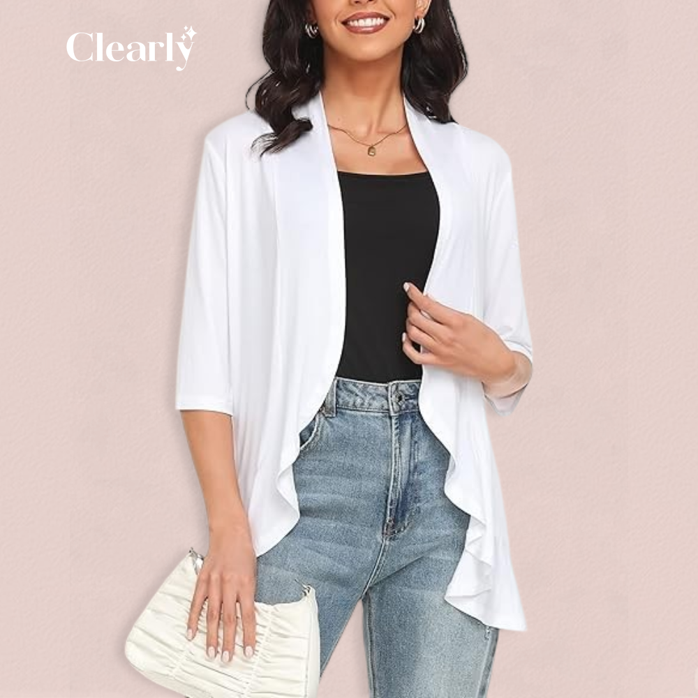 Otwarty krój tworzy w pełni kobiecą sylwetkę, która naturalnie dopasowuje się do Twojego ciała, a długość i swoboda rękawów zapewniają elegancję i wygodę. Ten kardigan to tajna broń w stylizacji – zarzuć go na top, sukienkę lub top i od razu wyglądaj elegancko i schludnie.